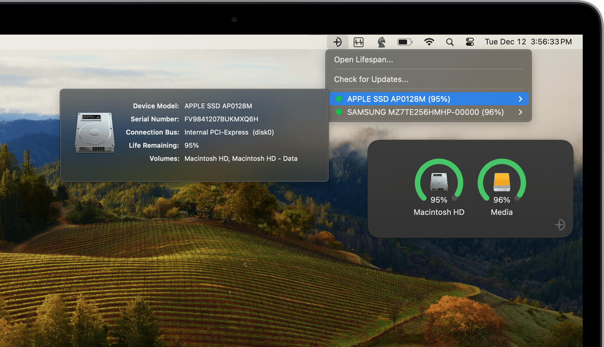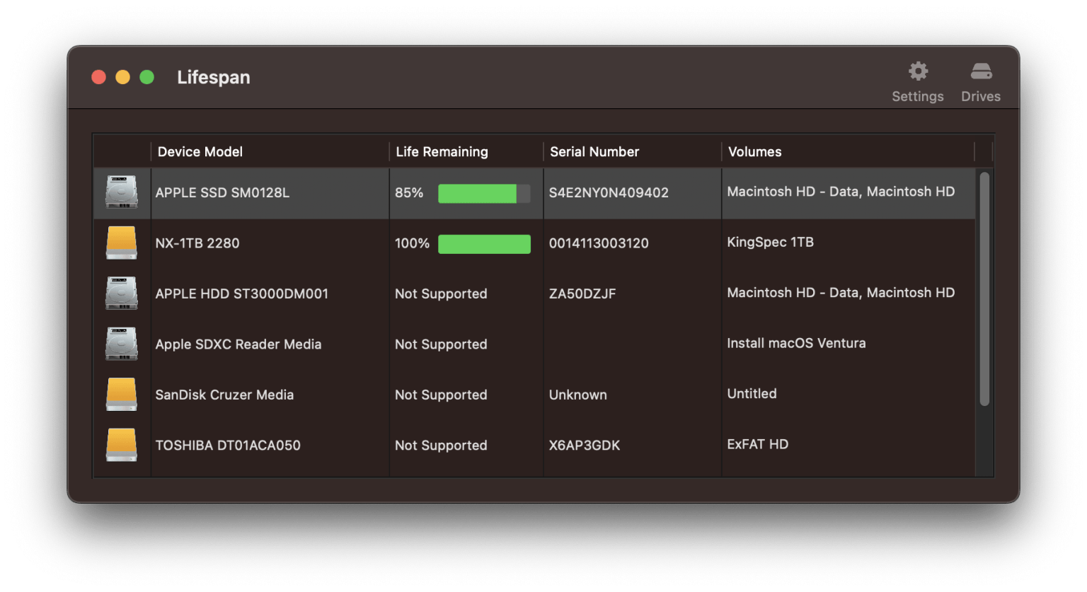 由于 Lifespan 是一款 macOS 菜单栏应用程序,因此使用起来非常简单。菜单中列出了每个驱动器,您可以以简单的百分比形式查看每个基于闪存的驱动器的运行情况。