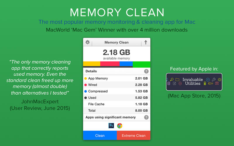 Memory Clean 是一款非常实用的Mac内存深度清理工具,小编亲测清理前空闲内存2.24GB,用Memory Clean 2 1.1 内购版深度清理后空闲内存有4.69GB,释放内存多达2.4GB之多,非常值得安装的一款内存清理软件,尤其是4GB内存以下的Mac用户,赶快下载释放你的内存吧。