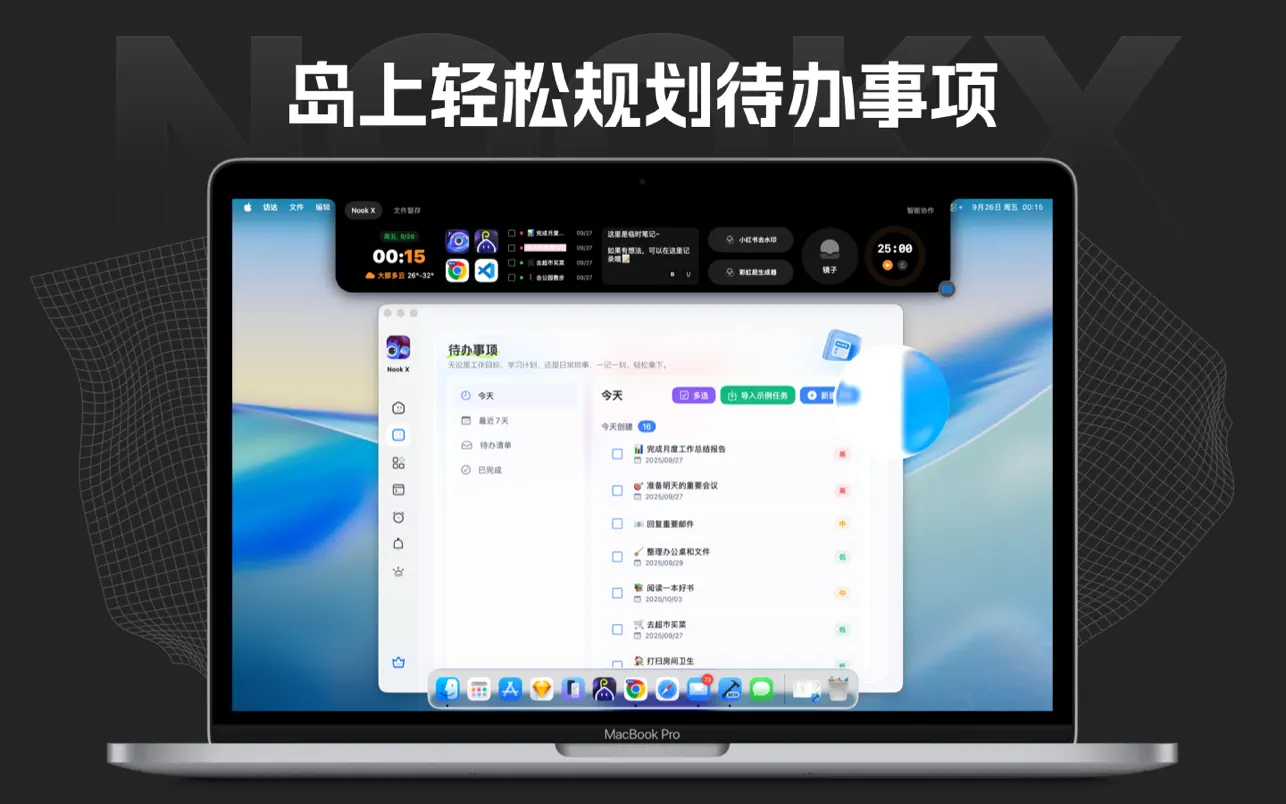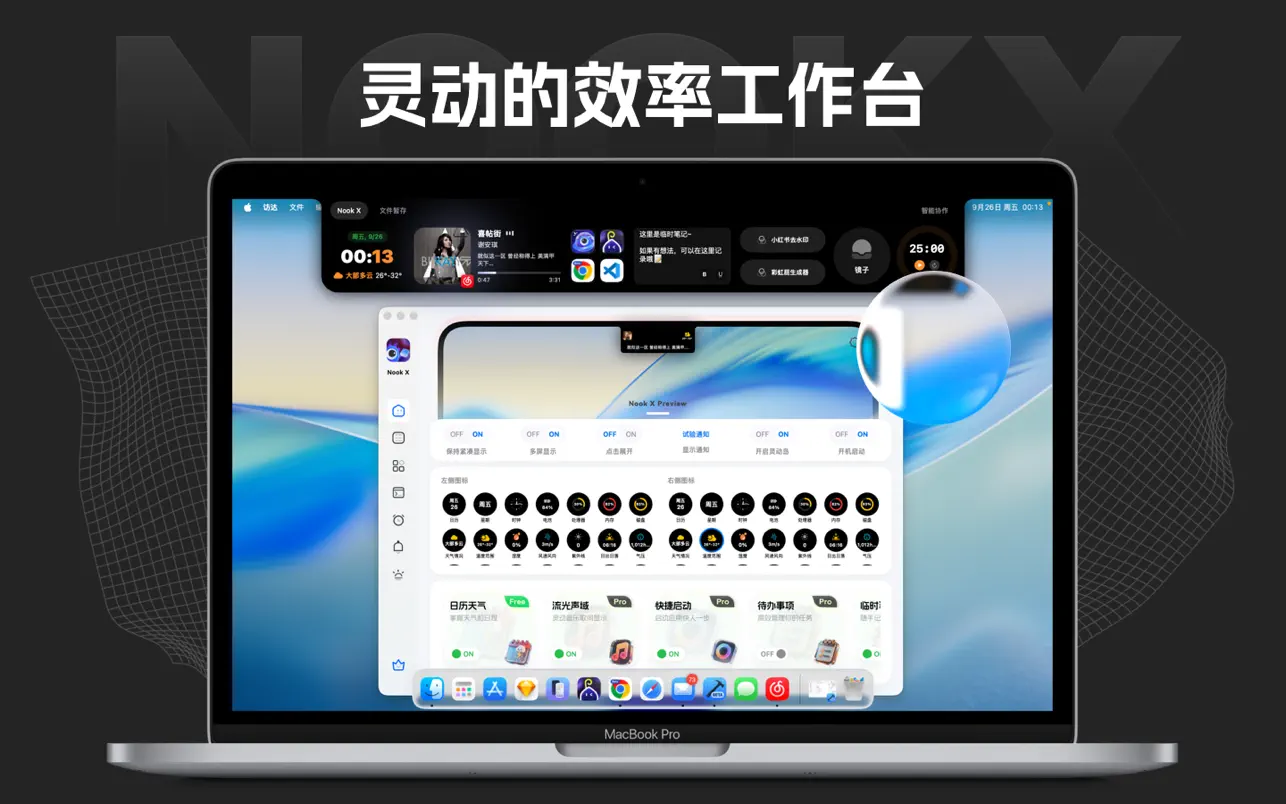 NookX for Mac 是一款专为 macOS 设计的创新效率工具,它巧妙利用 MacBook 屏幕顶部刘海区域,将原本闲置的空间转化为高度可定制的信息中心。无论你是开发者、设计师还是日常办公用户,NookX for Mac 都能帮助你高效管理常用功能和实时数据。通过拖拽式交互和丰富小组件,用户可以轻松显示日期、时间、天气温度、代办事项,甚至快捷启动应用,让刘海区成为智能助手。软件支持 macOS 13 及更高版本,ARM 架构优化,确保流畅运行,同时提供海量自定义选项,与桌面风格完美融合。NookX for Mac 不占用菜单栏空间,却带来无限可能,让你的 Mac 体验更智能、更便捷。