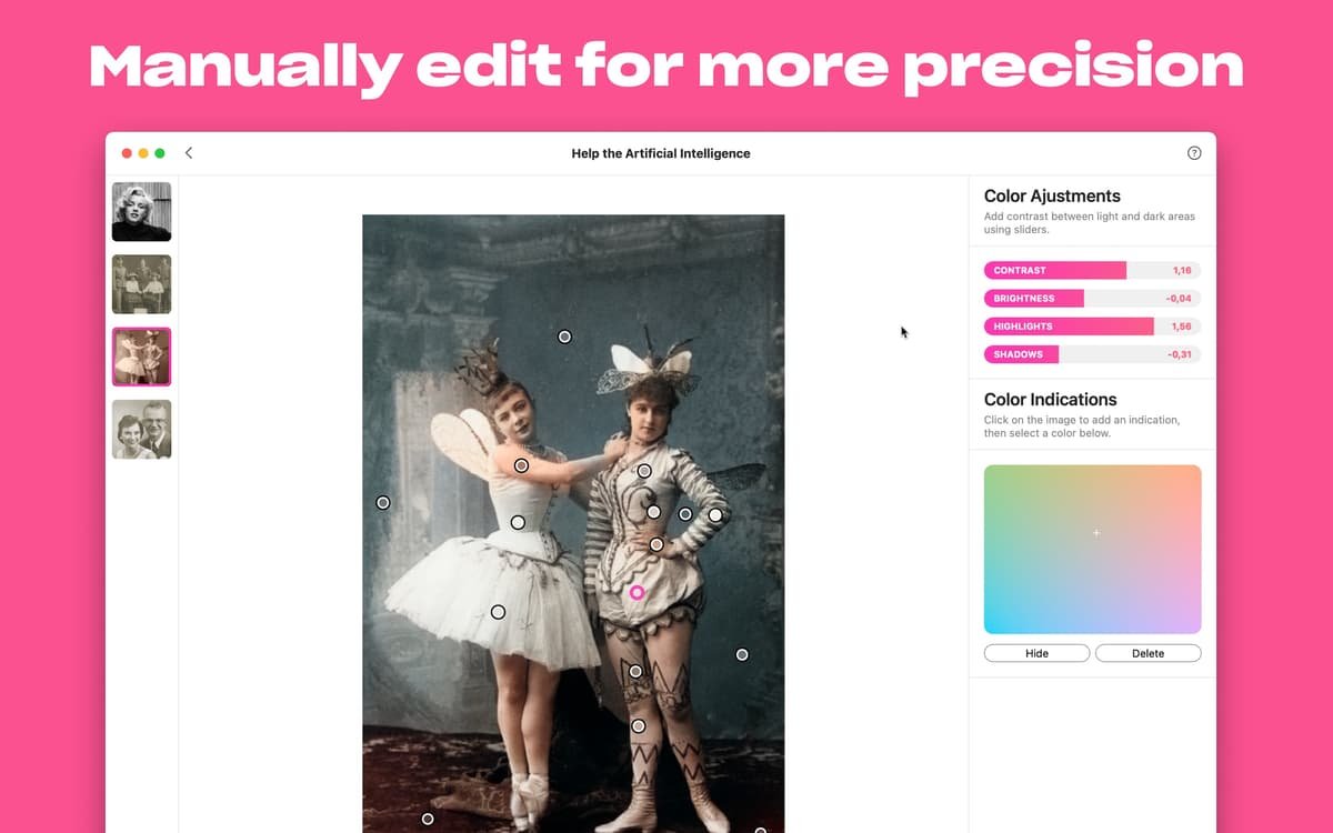 2. 手动颜色调整:用户可添加颜色指示点,精确控制渲染效果,实现个性化黑白照片修复。