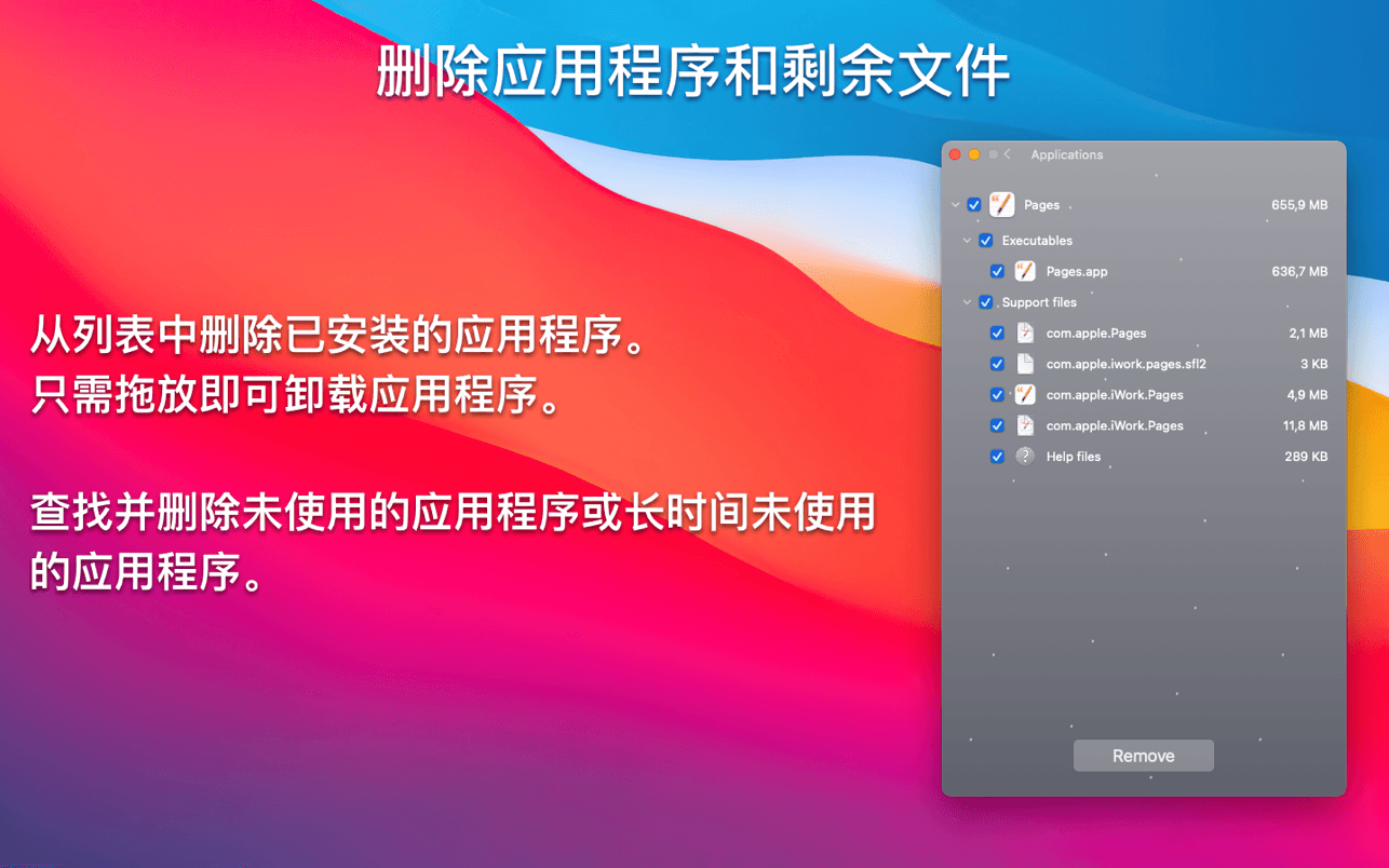 • 对于清理磁盘空间,从先前删除的应用程序中删除应用程序剩余文件。