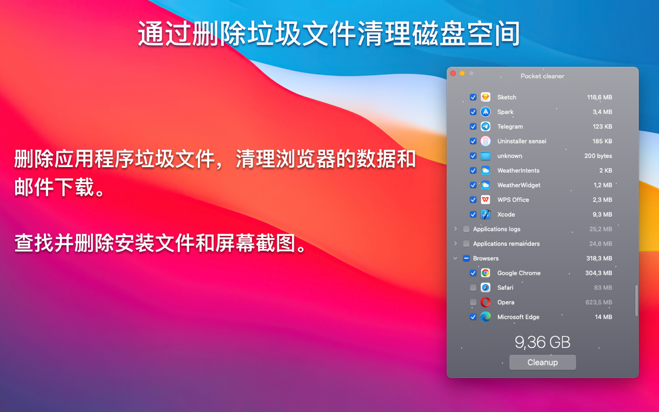 Pocket cleaner Pro 1.6是一款Mac系统清理程序,其中包括用于从Mac上不需要的垃圾文件中清理磁盘空间的工具套件。