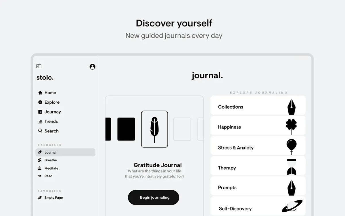 2. 引导式日记提供专家设计的提示,支持文本、语音笔记或图片视频记录,覆盖生产力、感恩和焦虑管理等主题。