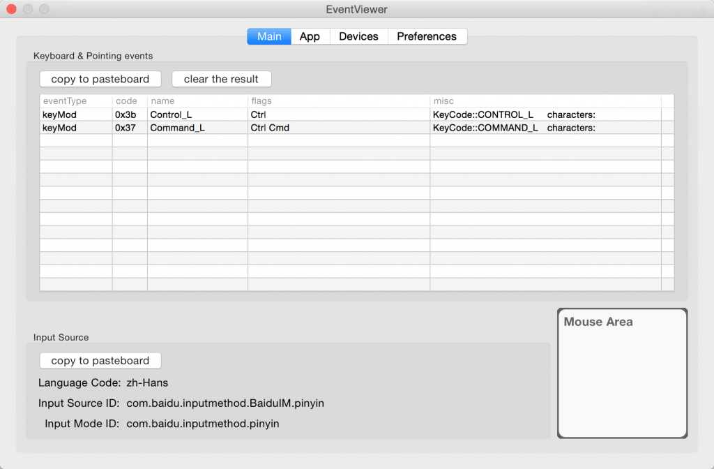此时每按下一个键,表格里都会出现相应的键的信息,注意我们这里需要的KeyCode不在『code』栏中,而是『misc』栏中显示的内容。如上图显示,左ctrl的代码就是CONTROL_L。
