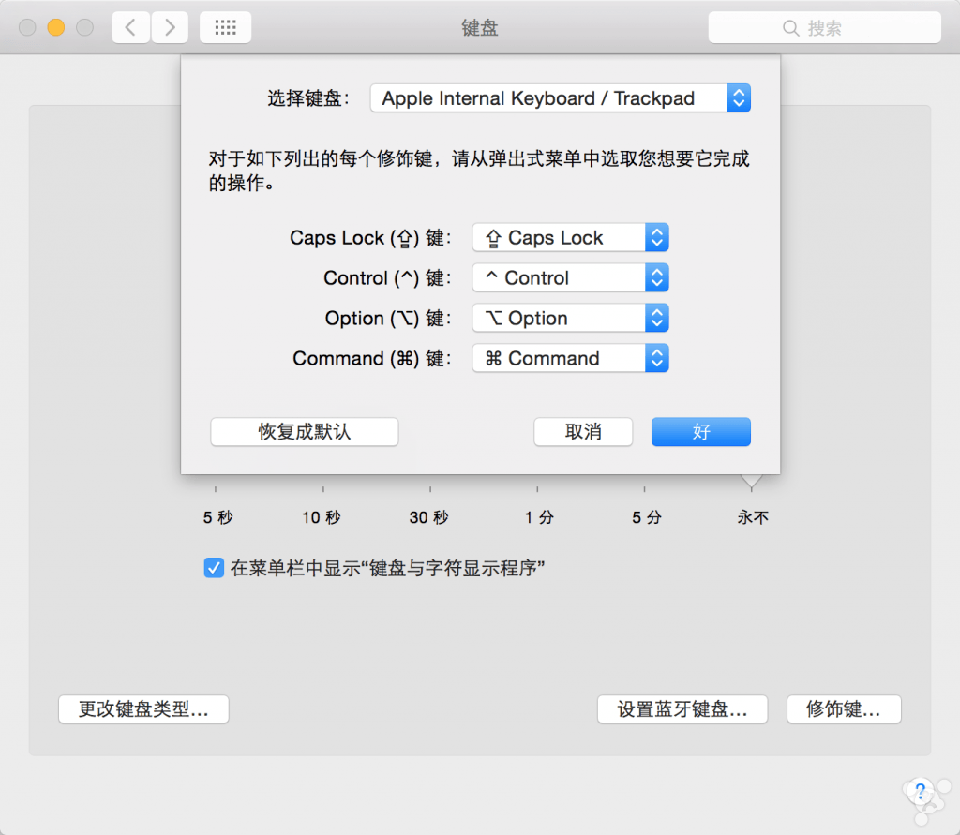 这里还有一点小问题,对于长时间使用mac键盘布局的人来说,这样的布局是和习惯刚好相反的。在mac键盘中,苹果键应该在alt的位置,而option则在windows key所在的位置,这时候可以用键盘设置中的『修饰键…』进行修改。最后把alt和windows的键帽拔出来换互换以防视觉上的混淆~ 完成后,可以通过command+C 和 command+V进行复制粘贴的测试