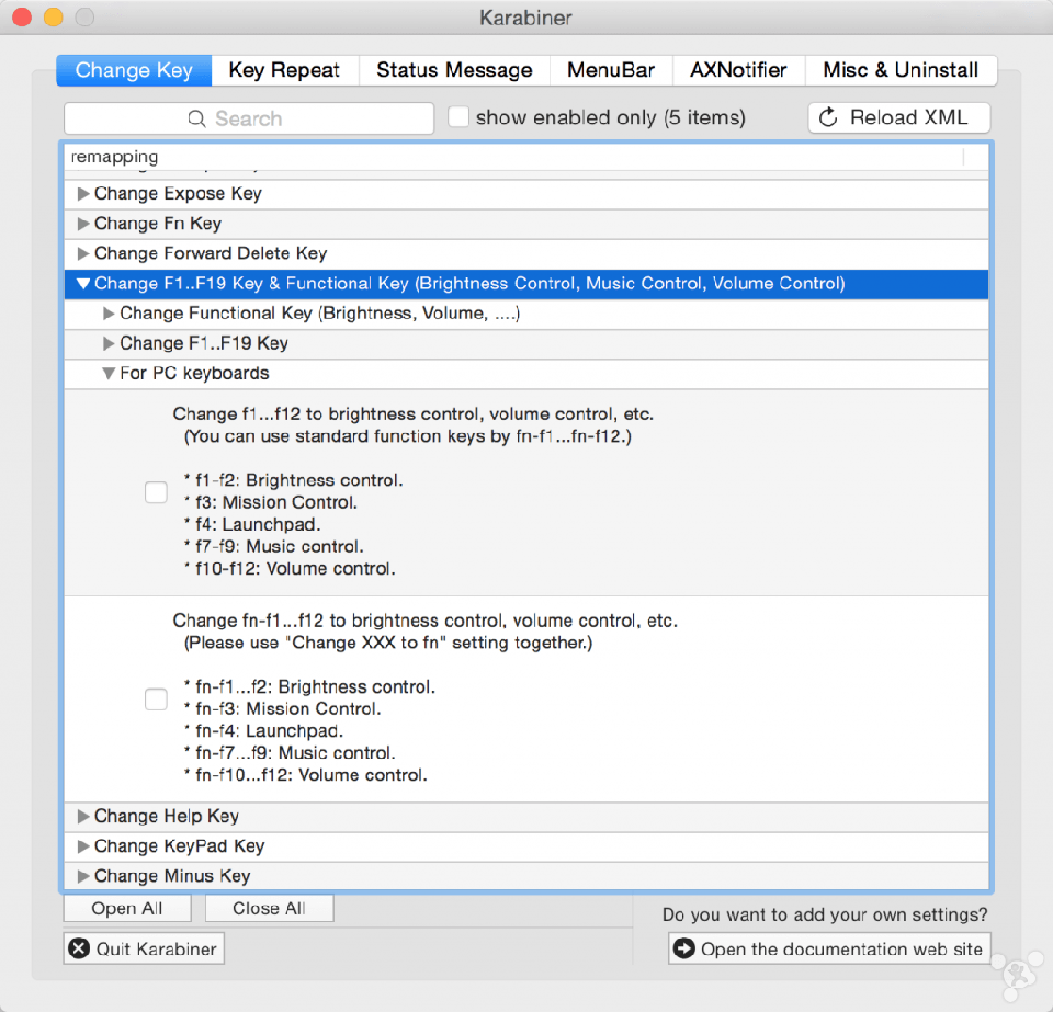想要把普通机械键盘的f区也改成这些功能,用系统自带的键盘设置已经做不到了,需要神器『Karabiner』的帮助,这是mac上一款可以随意更改键盘映射的软件,默认的选项已经十分丰富,并且支持脚本编写,功能很强大。