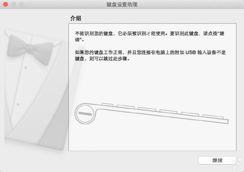 如果系统没有自动弹出提示,也可以通过“系统偏好设置”—“键盘”—“更改键盘键盘类型”来进行识别。识别之后,系统会将键盘上的Windows映射成苹果键,alt键映射成option键。