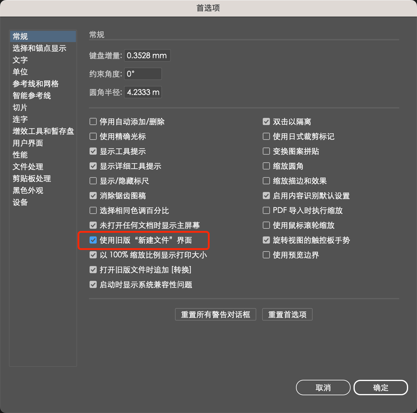 有用户反馈安装了Illustrator 2024 Mac版后无法新建文件,解决方法很简单:打开Illustrator 2024,点击顶部菜单栏“Illustrator” → “首选项” → “常规”打开设置界面,在右侧勾选【使用旧版 “新建文件”界面】,点击“确定”保存设置。然后按“command+Q”退出Illustrator,重新打开Illustrator按下“command+N”即可新建文件了。
