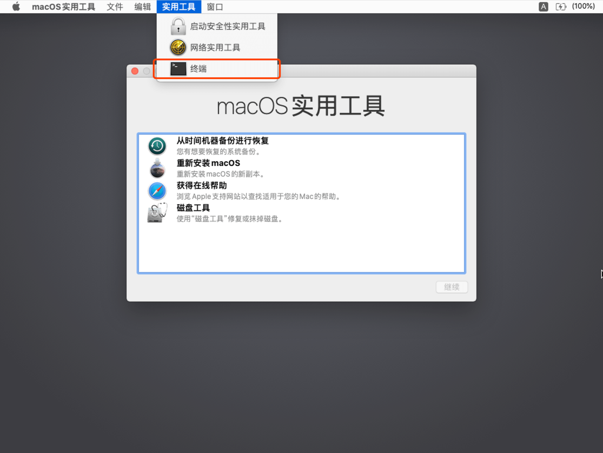 进入恢复模式后,在顶部菜单点击“实用工具”→“终端”打开终端,拷贝命令“csrutil disable”(不含引号)粘贴进去按回车,返回提示:“Successfully disabled System Integrity Protection.Please restart the machine for the changes to take effect.”即SIP关闭成功。