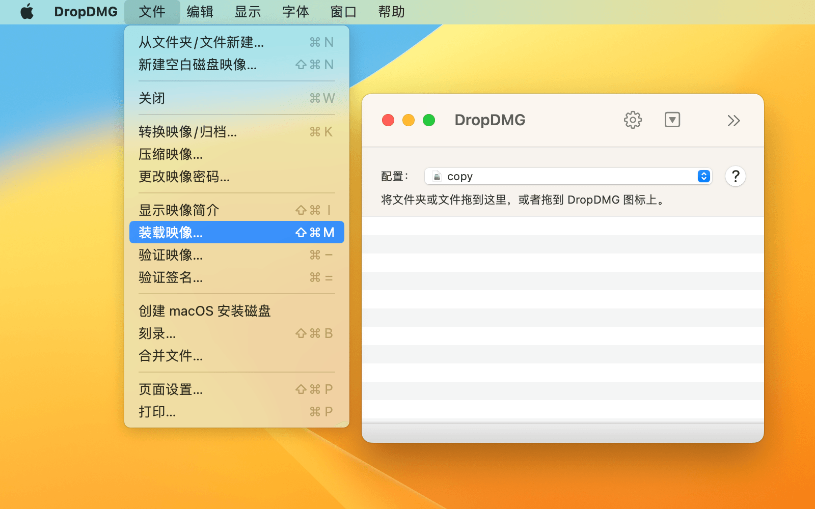 2. 打开DropDMG,点击桌面顶部菜单栏的“文件” → “装载映像…” 选择要打开的dmg文件打开即可正常装载dmg文件。