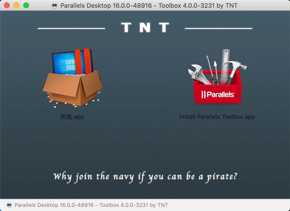 不过有一些用户反馈在安装Parallels Desktop 16时安装失败,打开“Parallels_Desktop_16.0.0-48916__Toolbox_4.0.0-3231_by_TNT.dmg”装载磁盘映像后,双击打开“安装.app”弹出提示: