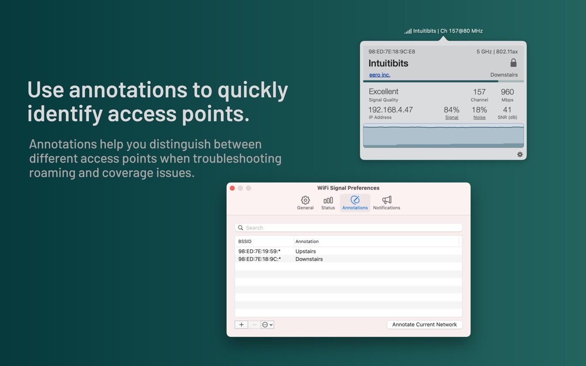 4. 接入点标注支持:允许添加自定义标签来区分不同接入点,比如标注楼层位置,与其他WiFi分析工具配合使用效果更好。