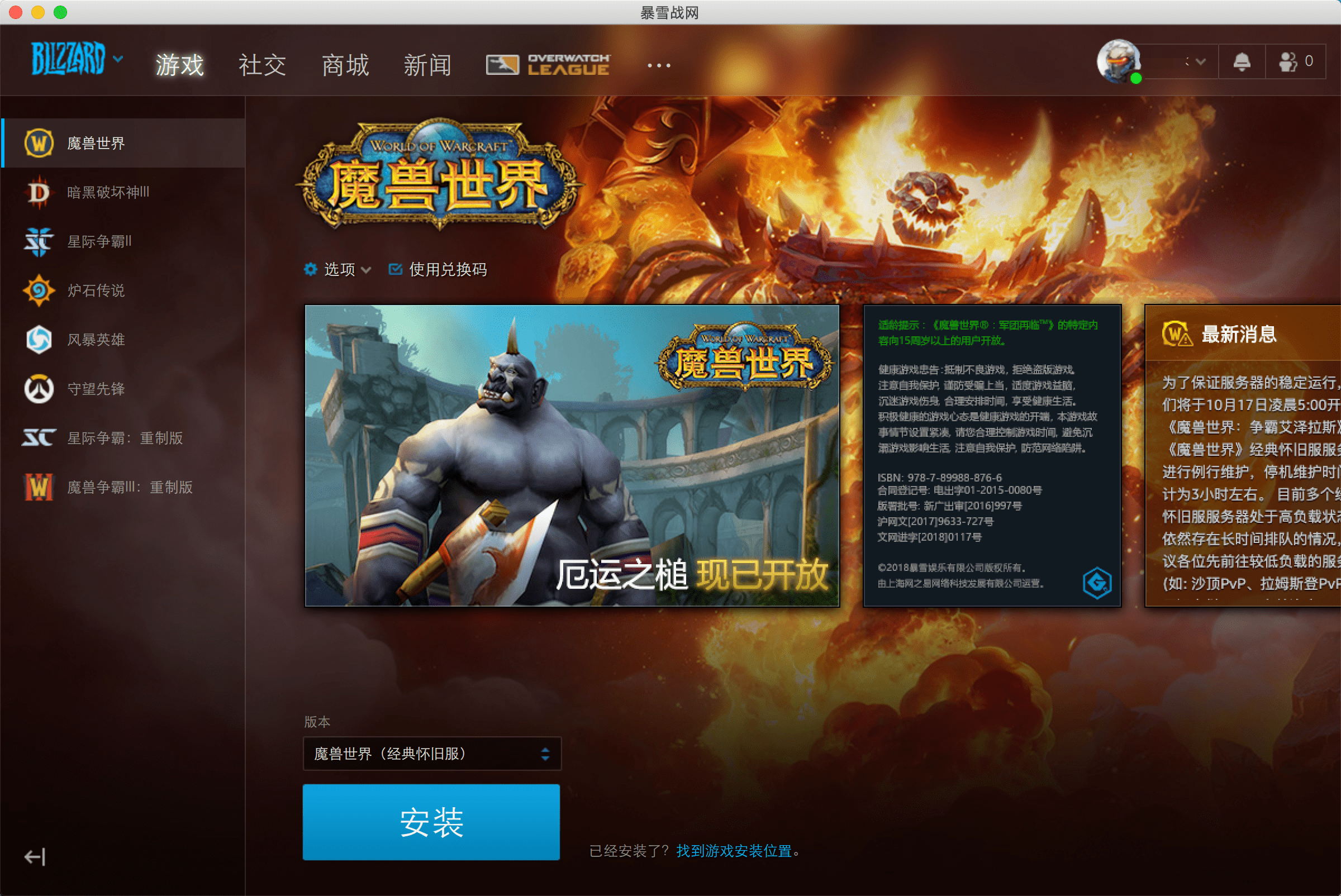 2、登陆战网客户端,在左侧菜单中选择《魔兽世界》,在版本菜单中选择“魔兽世界(经典怀旧服)”。点击安装按钮即可开始安装。安装完成之后,点击进入游戏按钮即可重温《魔兽世界》经典怀旧服Mac版。